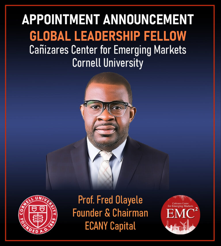 The Cañizares Center for Emerging Markets at Cornell University has announced the appointment of ECANY Capital Chairman Prof. Fred Olayele as its 2026 Global Leadership Fellow. The Global Leadership Fellows Program convenes visionary leaders with highly accomplished international careers to advance the frontiers of global business education and strategic affairs. According to the Center, “Fellows are world-class business leaders whose experience and expertise reflect EMI’s vision to be the premier institute for emerging markets worldwide. Through immersive teaching and mentorship, high-impact research, and dynamic collaboration, they bring C-suite perspectives to classroom engagements and address some of the most challenging issues facing today’s complex and interconnected world.” Learn more